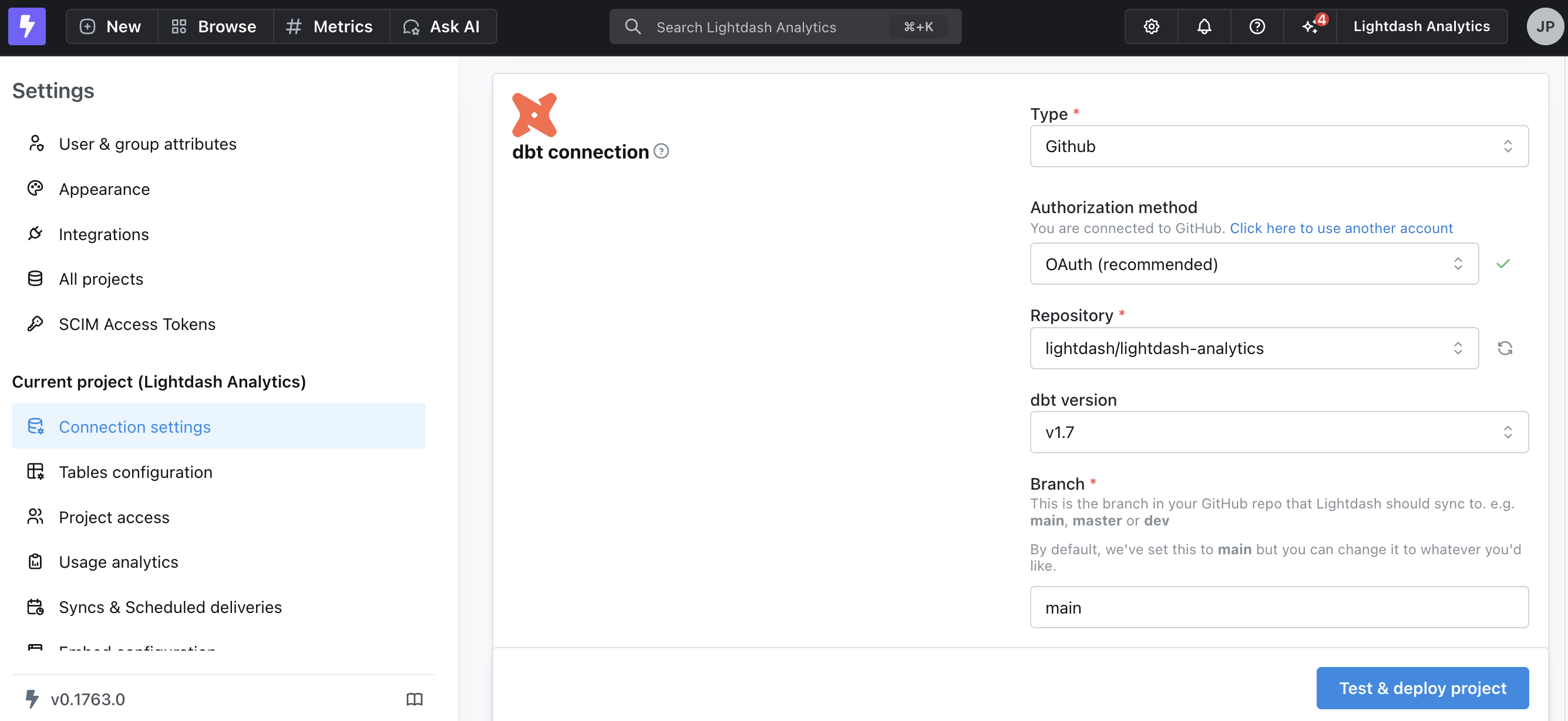 Connecting Lightdash to a hosted dbt project means that you’ll be able to keep your Lightdash instance in sync with the changes in your dbt project. To connect your dbt project, head to your project connection settings in Lightdash: