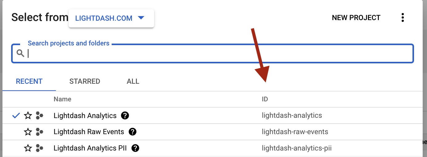 This is project ID from Google Cloud Platform for the data that you want to connect Lightdash to. To find your project ID, head to the BigQuery Cloud console. Once you’re in there, click on the project name in the top bar.