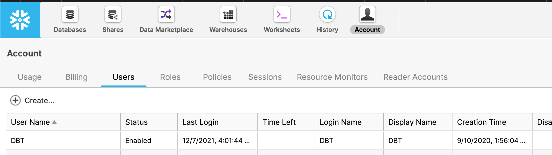 This is the login name for your Snowflake user. This is usually the same username you use to login to Snowflake. Alternatively, you can create a new user through the snowflake consolewith a username and password specifically for Lightdash to use. If you’re a snowflake admin you can list all users available in the snowflake console: